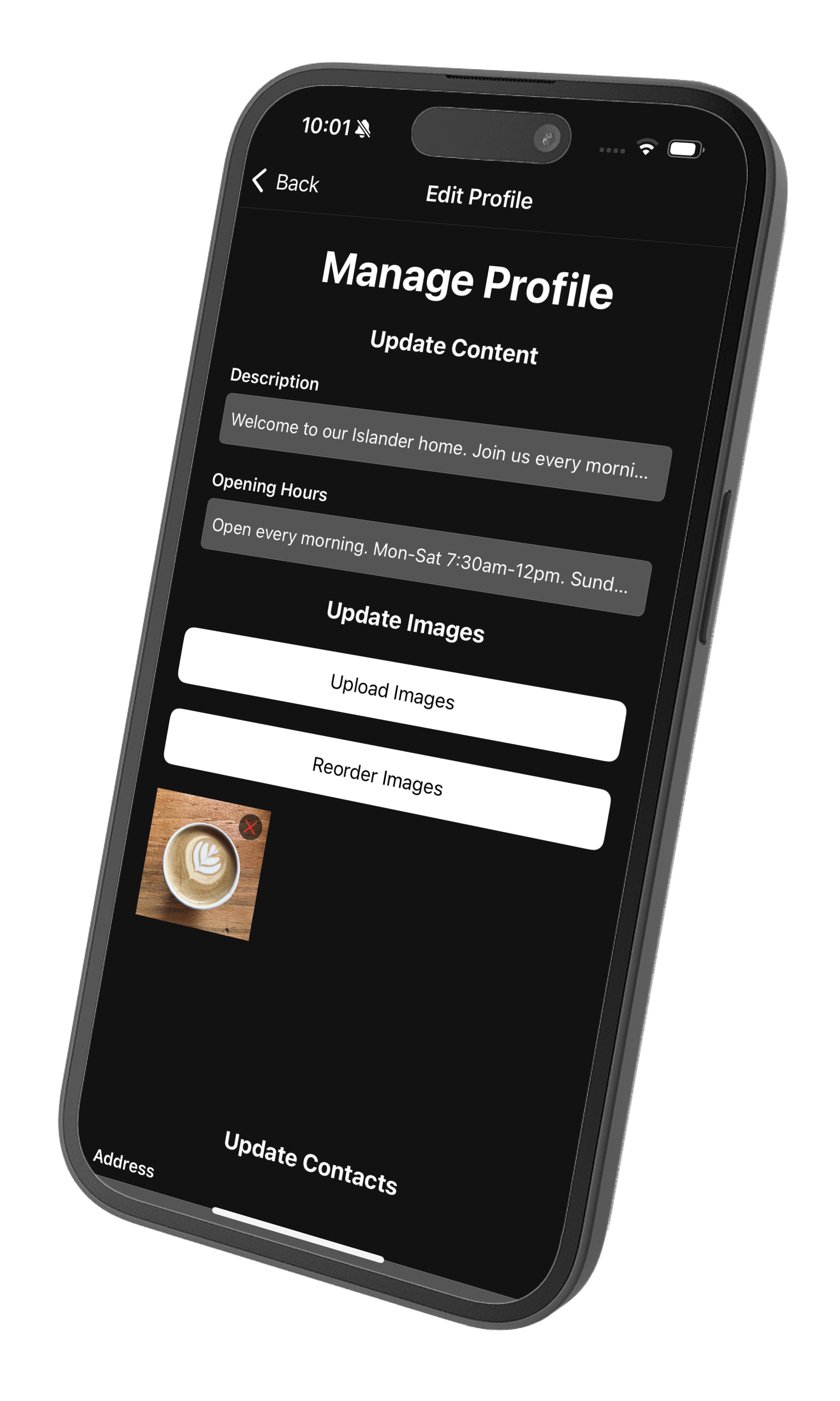 Tap the Edit Profile button to make changes to your profile including description, opening hours, photos, contact details and social links.
