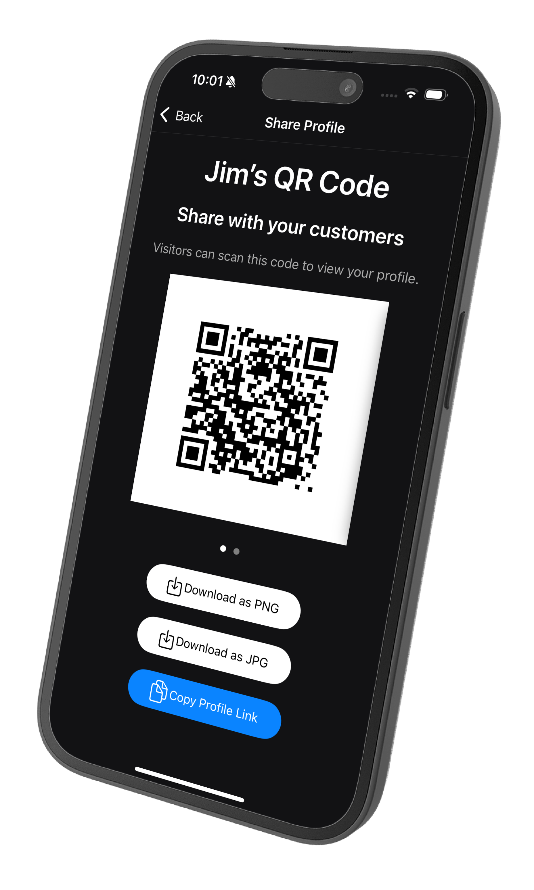 Tap the QR button to view and share your profile QR code and/or direct link. It works a little like a digital business card allowing you to share all of your latest details with in-person visitors.